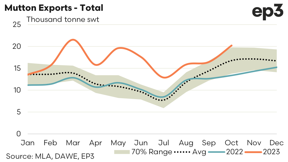 October 2023 saw a solid 23% lift in mutton exports over the month to hit 20,187 tonnes swt consigned offshore. This is the highest total monthly export flows have been since March 2023 and the best October result since 2018. Compared to the five-year average for October the current mutton export flows are sitting 20% ahead of trend.