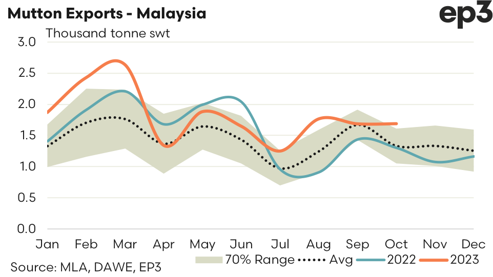 Malaysia – Aussie mutton flows to Malaysia remained consistent with just 3 additional tonnes shipped in October 2023 compared to September. There was 1,689 tonnes swt of mutton reported exported from Australia to Malaysia during October, representing levels that are nearly 27% above the five-year average for October.