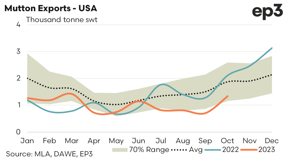 Saudi Arabia – Posted another huge month, despite Aussie mutton export volumes easing by nearly 18% over October. There was 1,261 tonnes of Aussie mutton shipped to Saudi Arabia in October 2023, which is the best October result since 2018. Despite volumes coming off from the September seasonal peak current trade levels still sit a healthy 120% above the five-year average level for October.