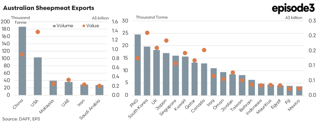 Australian sheep meat exports are highly diversified, with Asia and the Middle East accounting for the majority of demand. In Greater China, more than 186,000 tonnes were shipped in 2024 worth nearly A$0.9 billion, dominated by frozen lamb and mutton for hot pot and barbecue foodservice. Chilled access is expected to expand following approvals for additional plants, lifting premium demand in urban retail and high-end restaurants.