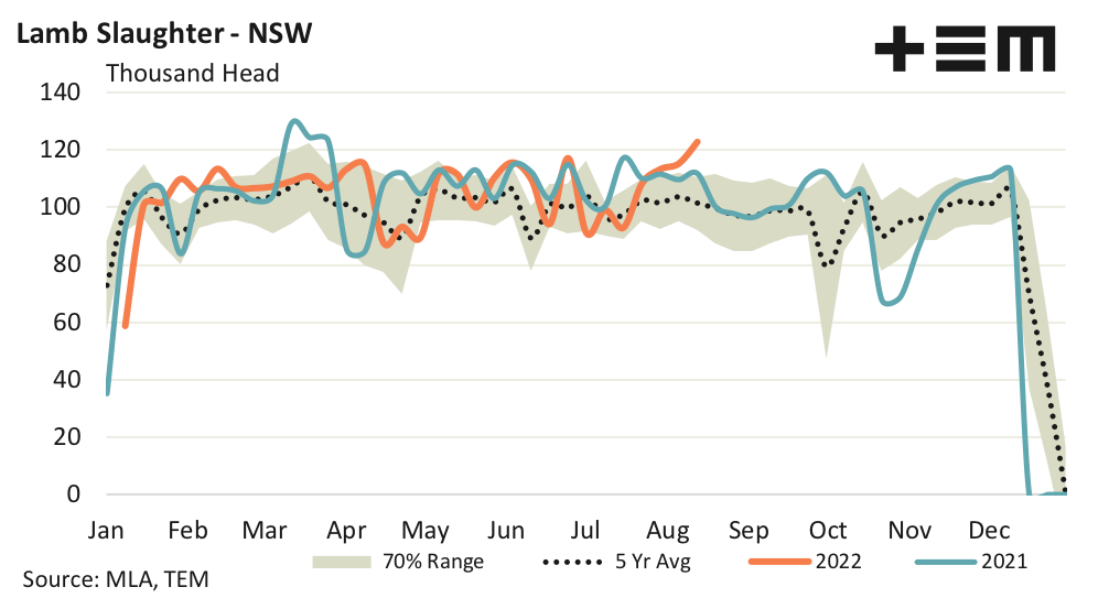 The week ending 12th August saw some strong volumes of lamb processed in NSW abattoirs. At 122,928 head of lamb processed for the week NSW slaughter volumes were the highest recorded so far this year. Indeed, it was the highest weekly lamb kill in NSW since the end of March 2021.