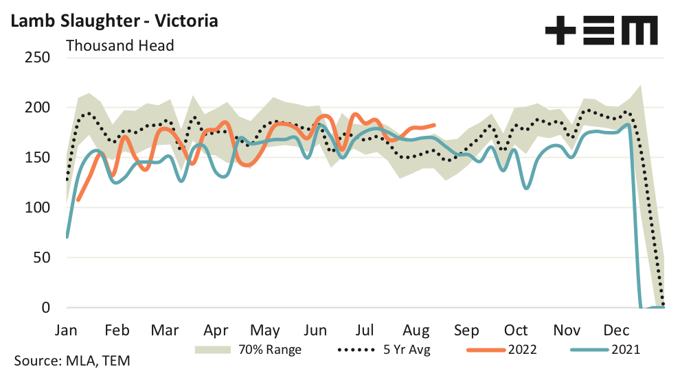 In Victoria lamb slaughter levels remained solid, but didn’t demonstrate the strong uplift seen in NSW. There were 182,409 head of lamb processed in Victoria for the week ending 12th August, which was nearly a 2% lift on the previous week’s volumes. Compared to the five-year average for this week in the year the Victorian lamb slaughter figures are nothing to discount too readily though, as they are still trekking 16% above the average trend.