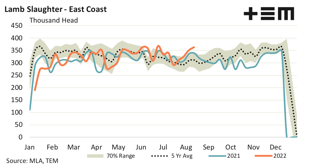 Combined strong lamb slaughter volumes in NSW and Victoria have pushed the total weekly east coast lamb cull to 362,824 head, which is the second highest weekly volumes seen this year. The highest weekly lamb slaughter on the east coast this year was the 368,271 head registered back at the end of June. Current lamb slaughter levels on the east coast are running 16% above the five-year average pattern for this week in the year.