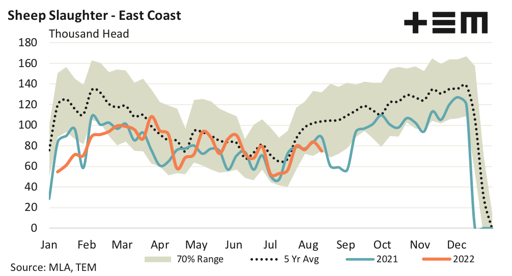 Although the space being made on the abattoir kill floor for lambs has come at the expense of sheep volumes. Weekly east coast sheep slaughter levels eased nearly 11% to the week ending 12th August to see 74,683 head processed. This represents volumes that are nearly 28% under the five-year average trend for this week in the year.