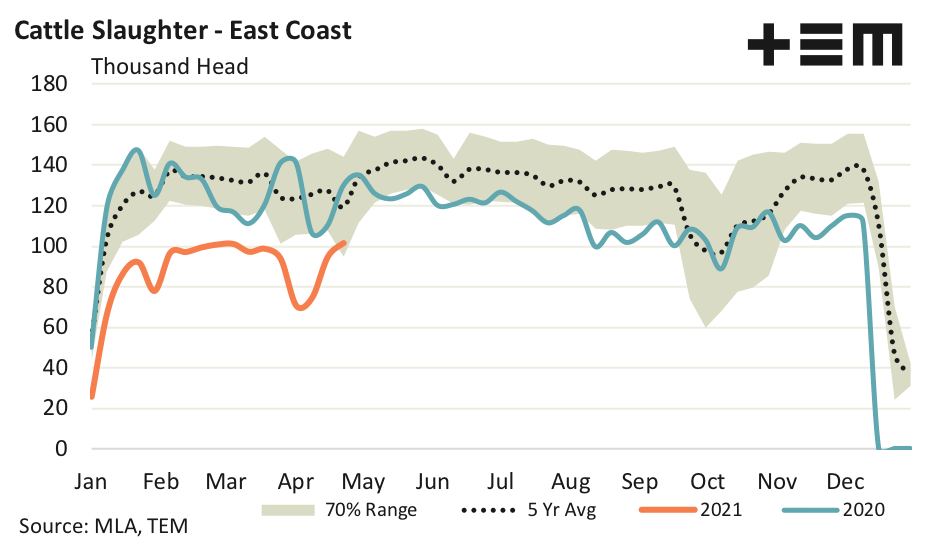 East coast cattle slaughter has been travelling well below the bottom of the 70% range for much of the year, reflective of the tight supply, low herd numbers and increased restocking intentions. Indeed, the average weekly slaughter volumes since the start of 2021 have been running 30% below the five-year seasonal pattern and 18% below the bottom of the 70% range boundary. For the week ending the 23rd April cattle slaughter volume has moved to just 15% below the five-year seasonal pattern and is 7% higher than the bottom end of the normal range.