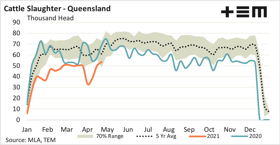 Increased cattle slaughter volumes in Queensland are driving the east coast numbers higher. Weekly slaughter levels in Queensland lifted by 7% on the week prior to sit just 12% below the five-year average pattern for this week in the season. Weekly cattle slaughter in Queensland hit 53,472 head for the week ending on the 23rd of April and this is the highest weekly volumes recorded in Queensland this year.