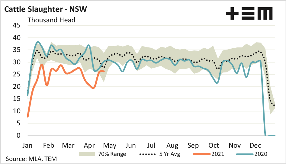 - NSW cattle slaughter levels are only 6% under the seasonal average levels that could be expected for this time in the year, based on the five-year average pattern.