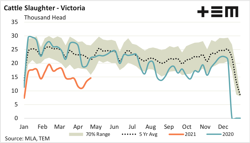 - Victoria remains the laggard state with cattle processing levels that are 31% under the five-year average trend for this time in the season.