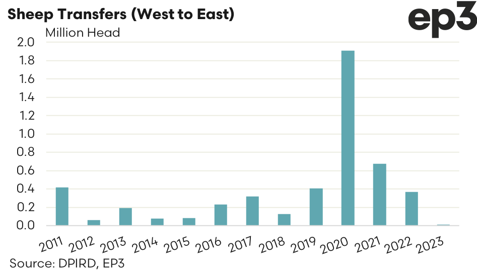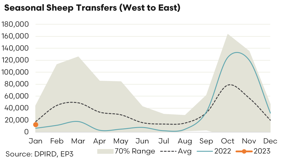 In 2022 the first three quarters of the year saw only 91,000 head of sheep transported from west to east. In the final quarter of the year, mainly in October and November, an additional 277,000 head made their way from west to east as the price discount of western sheep to their eastern counterparts widened significantly, thereby making the transport worthwhile for the eastern buyer.