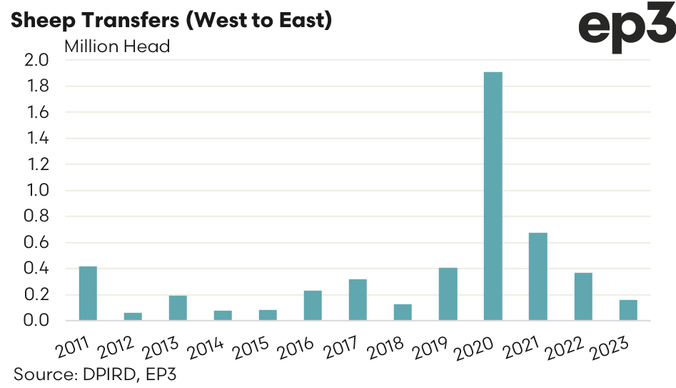However, the 2020 season was a huge year for shipments so that probably inflates the ten-year average flows. If we remove the 2020 data and compare the current trend to the longer term average volumes then the current flows are pretty close to average levels with the January to September total shipments at nearly 162,000 head for 2023 versus the January to September average of around 164,000 head.
