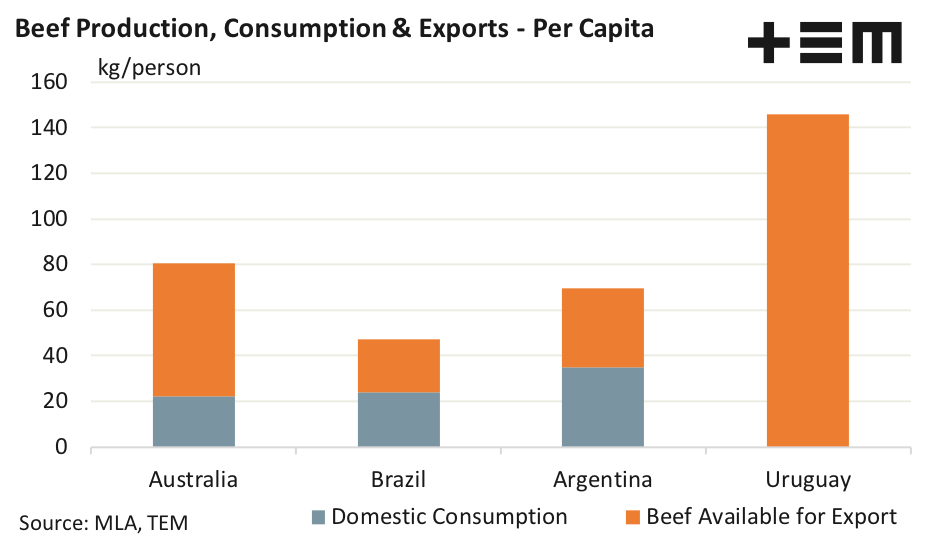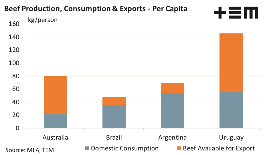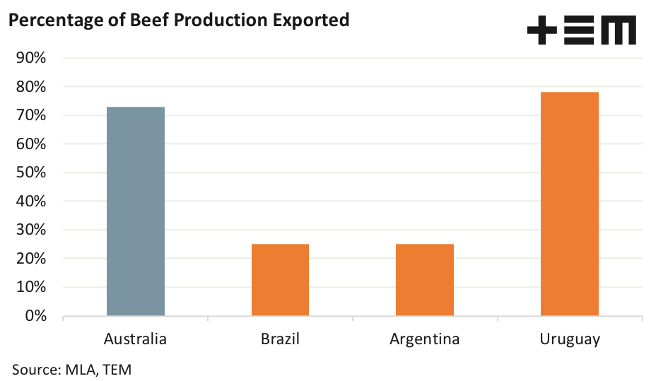 - Australia and Uruguay are heavily export orientated at 73% and 78% of production exported, respectively. Argentina and Brazil export just 25% of the beef they produce.