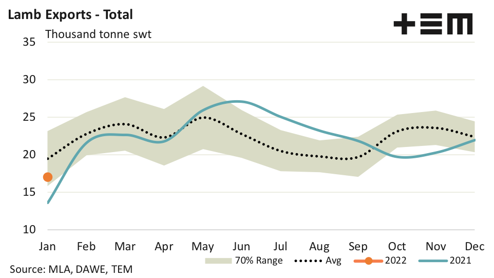 - Total lamb export volumes from Australia saw 17,057 tonnes shipped for January, which is 25% higher than January 2021 but 13% under the five-year average for January.