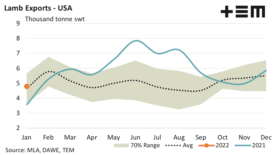 The Department of Agriculture, Water and Environment (DAWE) lamb export statistics for January 2022 show a solid start to the year for demand from the USA with trade volumes coming in 35% higher than in January 2021 at 4,791 tonnes swt. Although it isn’t the highest January volumes on record lamb exports still came in 3% above the five-year average trend for January.