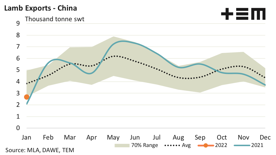 - Chinese demand for Aussie lamb was 29% higher than the volumes seen last year, but remain 30% below the average levels for January according to the five-year average trend.