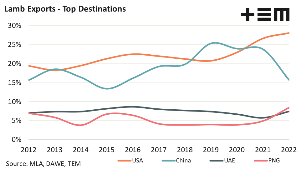 The strong start to the season for the USA, combined with a weaker January for Aussie lamb export flows to China, have seen the US extend their lead as the number one destination for Australian lamb with their market share opening 2022 at 28.1% of total flows compared to China’s 15.7%. Although, with just one month into the season there is plenty of time for China to play some catch-up.
