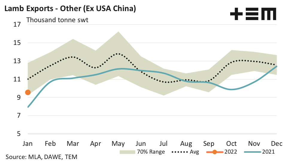 - Lamb export flows to “all other destinations”, excluding USA and China, was 20% above the January 2021 levels but 13% under the seasonal five-year average trend for the start of the year.