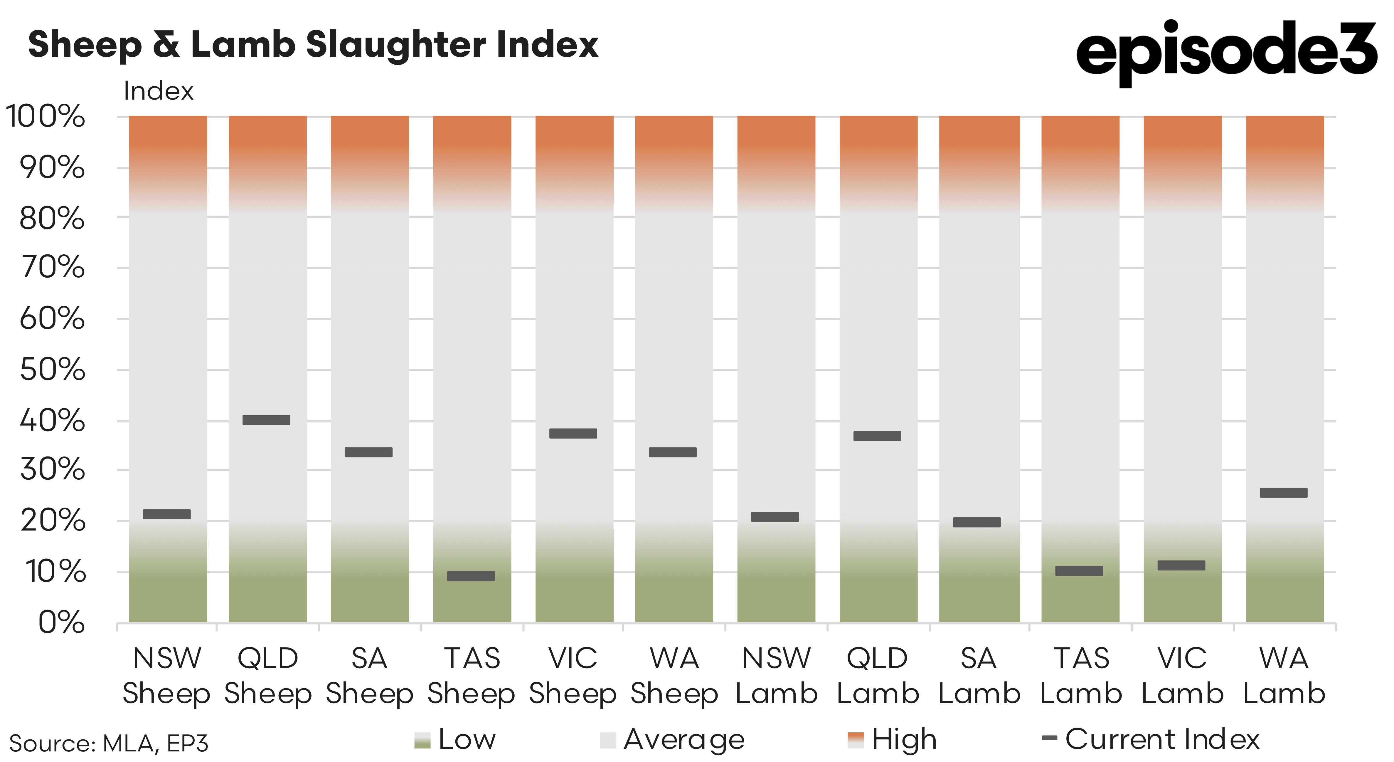 Tasmania rose modestly from 7 percent to 10 percent, while Victoria declined marginally from 12 percent to 11 percent. Victoria’s persistently low lamb slaughter index, despite the state being a major lamb-producing region, confirms that the spring flush is delayed. New South Wales recorded a six-point drop, from 26 percent in August to 20 percent in September, further reinforcing the limited lamb availability even as seasonal conditions improve.