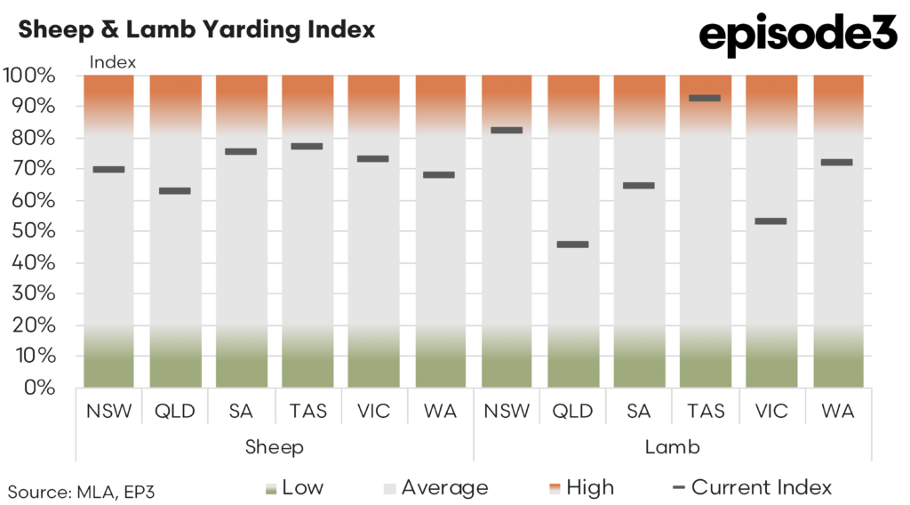The saleyard yarding index scores, which can be viewed similarly to a decile-based rainfall gauge, offer a useful relative measure of throughput compared to historical norms. An index score of 50% would reflect average yardings for the time of year, while higher or lower percentages reflect yardings above or below those longer-term levels. This structure allows for an easy visualisation of how supply is tracking seasonally, regardless of absolute volumes.