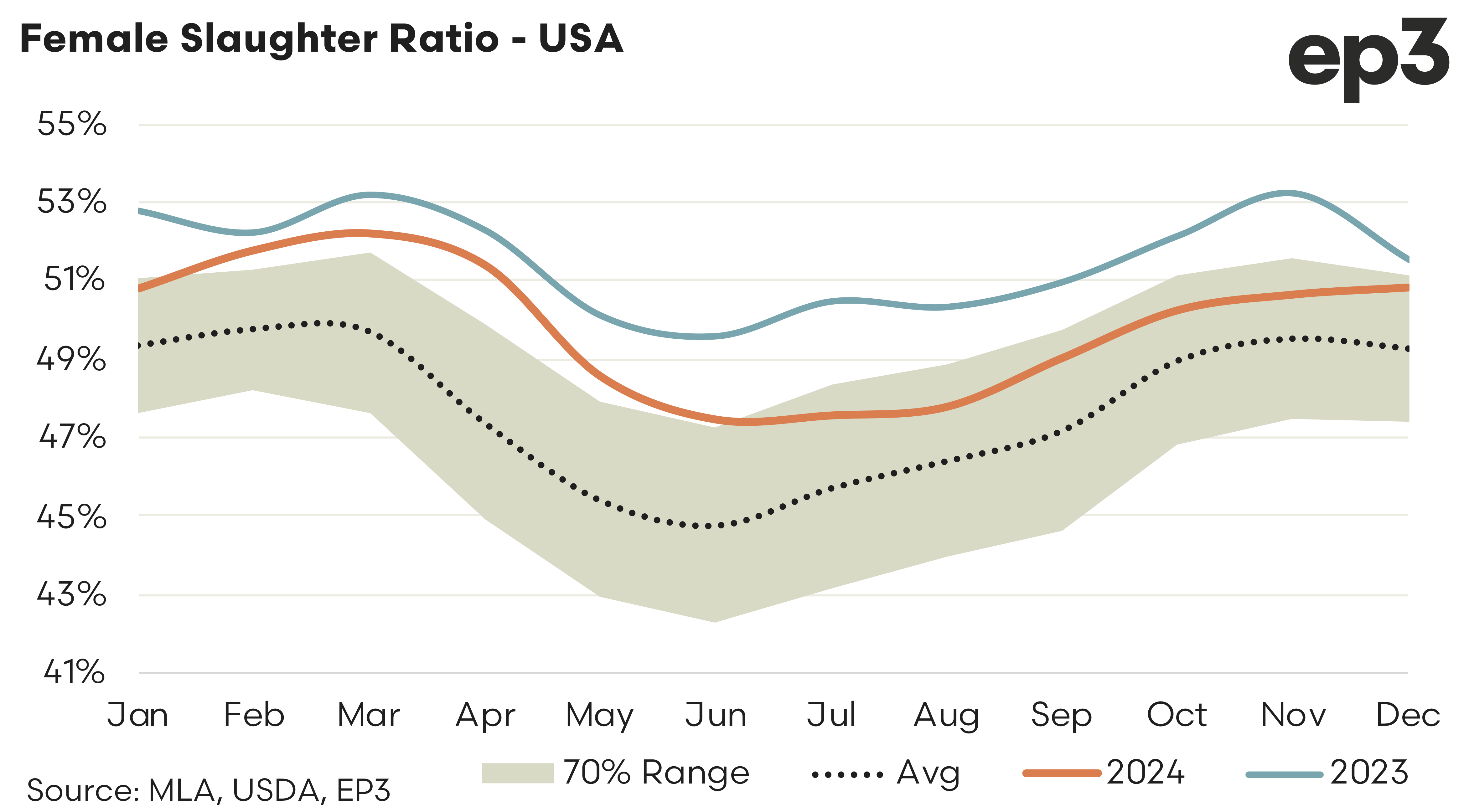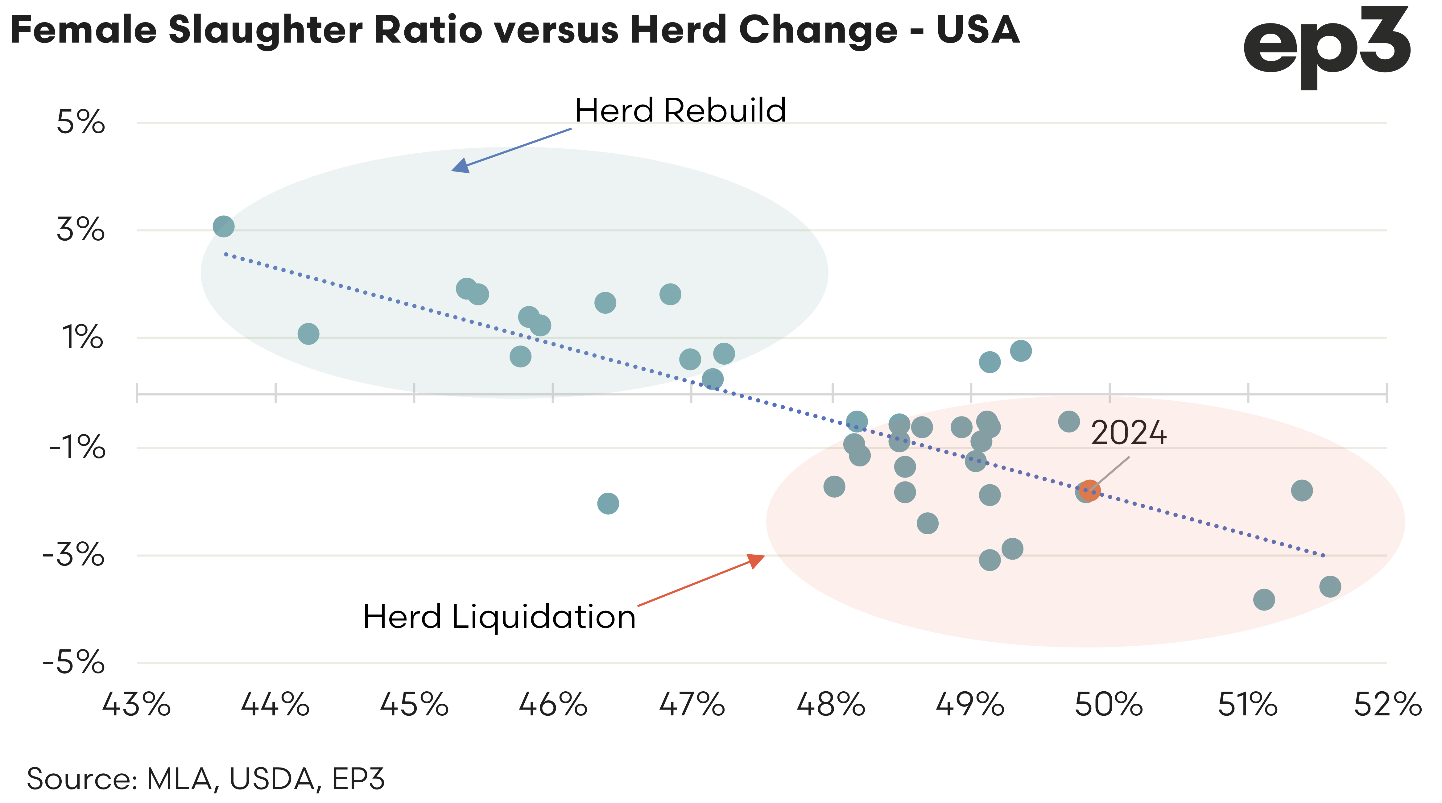 USDA data that allows us to measure the FSR is only available to the end of December 2024. As the seasonal chart highlights, above, the FSR was lower in 2024 than in 2023, indicating the pace of the liquidation has weakened during 2024. But the data shows that they are still in liquidation. Specifically, we look at the FSR level, below about 48% would denote a move into rebuild phase.