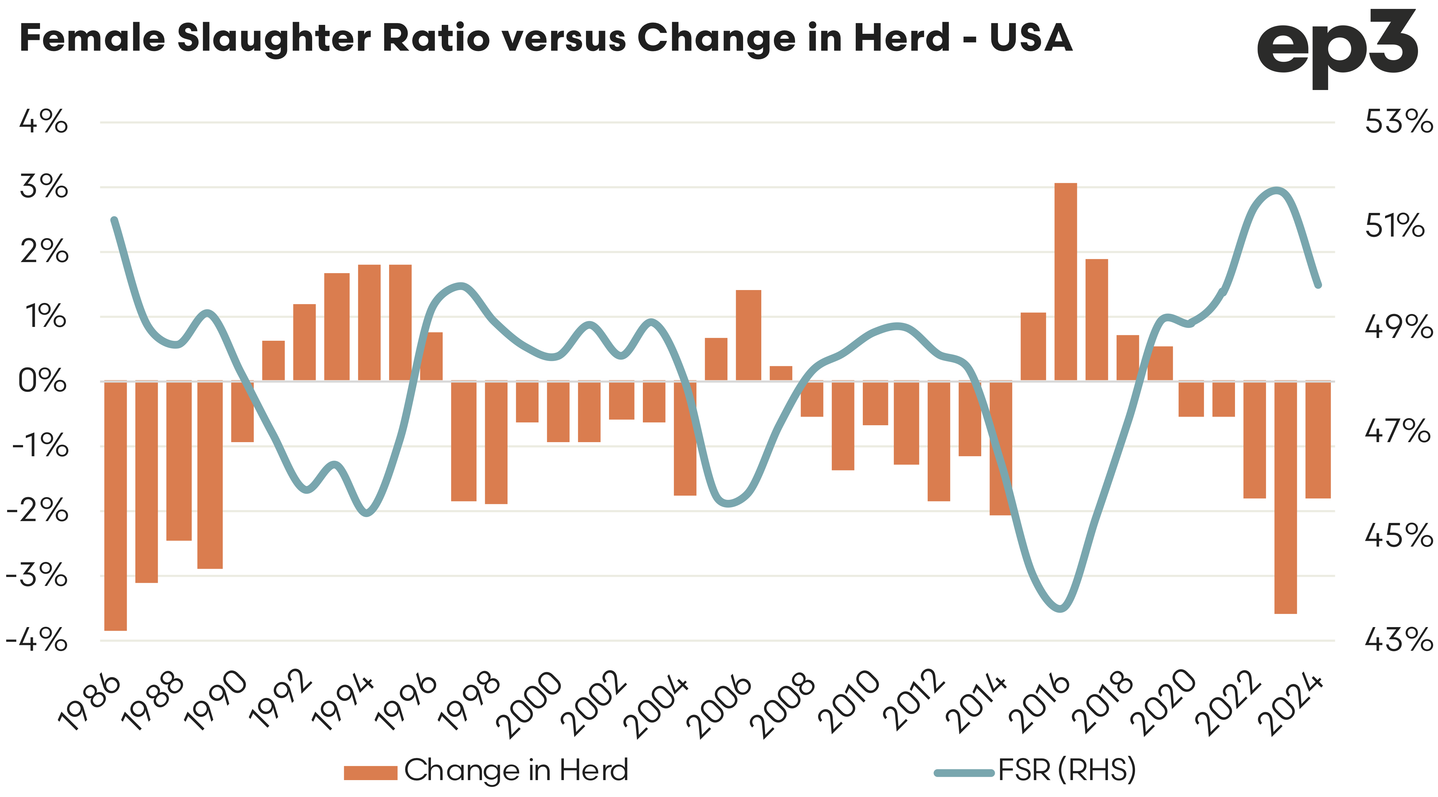 The annual average FSR in the USA as at the end of 2024 was 49.9%, while the trend is clearly moving towards the tipping point into rebuild we aren’t there yet. Perhaps we need to wait until the USDA monthly slaughter data is available for January or February to see if we have moved into rebuild in the USA.