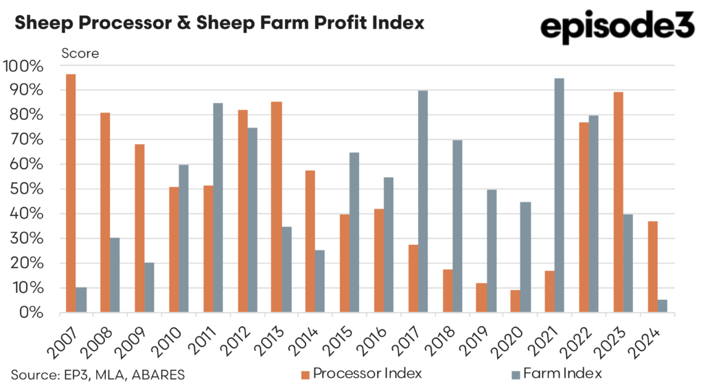 When reviewing the long-term trends highlighted by the SPTC Index, an intriguing counter-cyclical relationship with the ABARES sheep farm profit index becomes apparent. Over the years, the data reveal that when processors perform well, sheep farmers often face tougher conditions, and vice versa. For example, in 2007, the SPTC Index stood at an exceptionally strong 97%, indicating highly favourable conditions for processors, while the sheep farm profit index was a mere 10%.