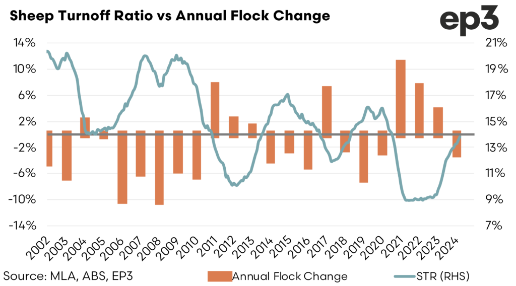 Australian Bureau of Statistics (ABS) sheep slaughter numbers, along with live sheep export volumes, for the second quarter of 2024 have been released and it shows thats the sheep turnoff ratio (STR) is edging ever closer to flock liquidation territory. In Q1, 2024 the STR was sitting at 13.7% just 0.3% below the 14% threshold between flock rebuild and liquidation.