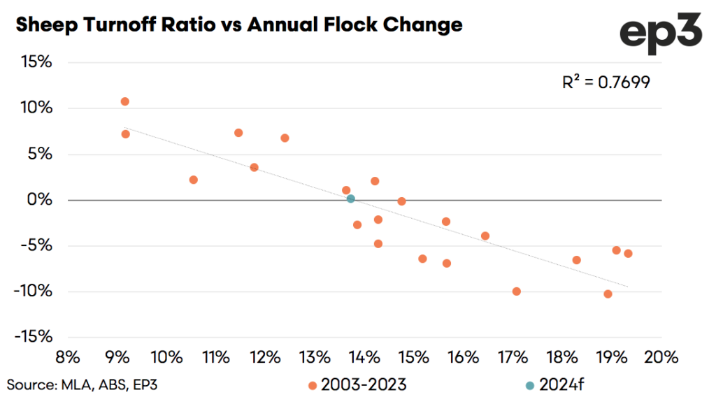 As of quarter two 2024 the STR has lifted to 13.9%, virtually sitting right on the fence between a flock increase and a flock decline. The scatter plot of the annual average STR versus the annual flock change highlights how the Australian flock is sitting at a tipping point presently. Meat & Livestock Australia are forecasting a 2.8% drop in the flock during 2024 and this seems a little heavy given the STR levels currently.