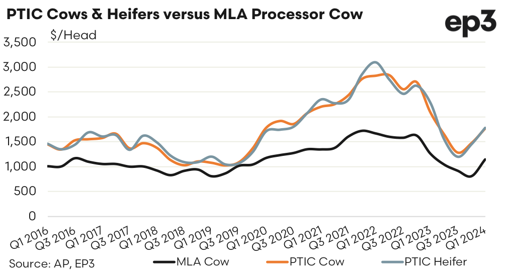 The positive sentiment for PTIC cattle has carried through to 2024 with average per head pricing so far showing increased gains on the Q4 2023 levels. PTIC Cows are up a further 20% to $1,767 per head and PTIC Heifers lifted another 23% to $1,781. Even the MLA Processor Cow Indicator has joined the party with a 41% increase in average price levels.
