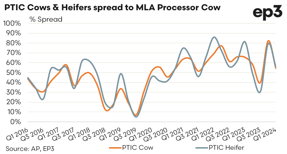 The more positive seasonal conditions into the 2020 – 2022 period saw PTIC premiums return with a vengeance with peaks recorded above an 80% premium. During Q3 2023 there was a bit of a lull in spread premiums with the PTIC Cow premium sliding from 80% to 30% over the quarter and PTIC Heifer premiums easing to 40%. However, premium spreads for both PTIC Cows and Heifers recovered swiftly to reach a peak again nearer to 80% during Q4 2023. Currently the PTIC Cow and Heifer premium spread to the MLA Processor Cow sits at 55%.