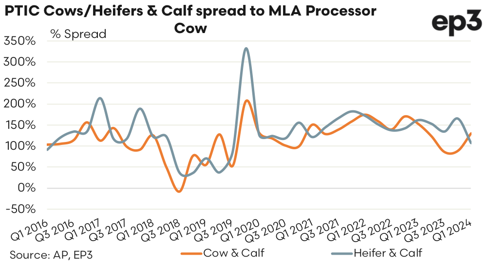 PTIC Cows and Heifers with calves saw spreads recover quickly in the early stages of the 2020 to 2022 herd rebuild phase with the Cow spread premium lifting to 200% and the Heifer spread peaking at around 330%. However, for much of the 2020 to 2022 period the premium spread for both categories ranged between 100% to 175%. The Cow/calf spread saw a dip towards 90% in late 2023 but has recovered to sit nearer to 130% in early 2024. Meanwhile, the PTIC Heifer with calf spread has opened 2024 at a premium of 107% to the MLA Processor Cow.