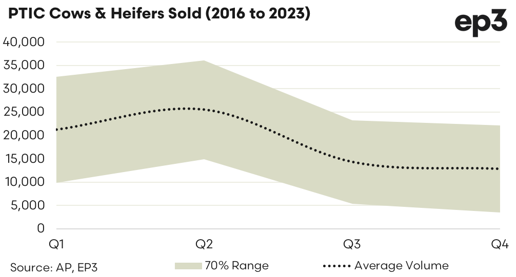 Analysis of AuctionsPlus quarterly volumes of PTIC sales for all types from 2016 to 2023 shows that there are usually stronger volumes transacted in the first half of the year. The average pattern demonstrates that sales volumes usually peak in Q2 at around 25,000 head of PTIC cattle sold. However, as the 70% range boundary highlights, in stronger seasons the volumes can peak closer 35,000 transacted head during the quarter and peak closer to 15,000 head in ess active seasons.