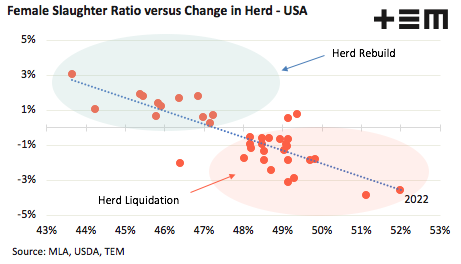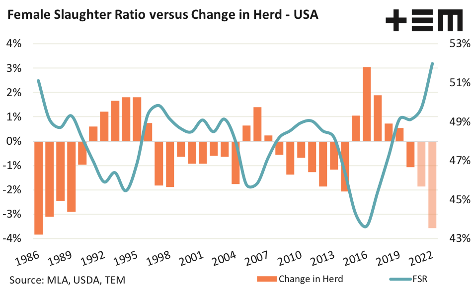 The FSR sitting at records levels of 52% in 2022 suggest the decline in the US herd this year could be significant, to the tune of 3.6% according to the line of best fit on the scatter plot. The last time the US FSR was above 50% was in 1986 when the FSR reached 51.1% and the US herd dropped by 3.8% that season.