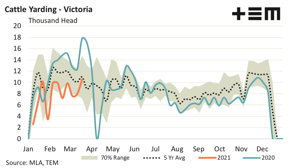 Victorian lamb and sheep weekly throughput levels have been elevated for some months now. Cattle yarding levels are beginning to climb too with the highest posting for the season reached for the week ending 19th March at 10,567 head of cattle.