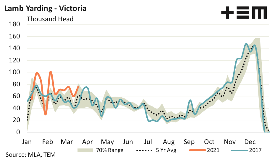 Victorian lamb yarding also posted a lift in volumes on the week prior, with 75,288 lambs presented at the saleyard. This represents a 26% gain on the volumes seen for the previous week (ending 12th March) and puts Victorian lamb throughput 24% above the weekly average for this time in the season.