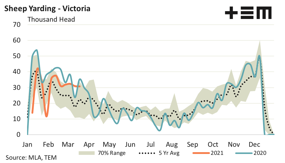 Victorian sheep yarding levels for the week ending 19th March were a bit more muted, with volumes tracking sideways and nearly matching the near 31,000 head registered on the week prior. A total of 30,638 sheep were presented and despite the lack of a strong week on week gain this still represents throughout levels that are 38% above the five-year average seasonal pattern.
