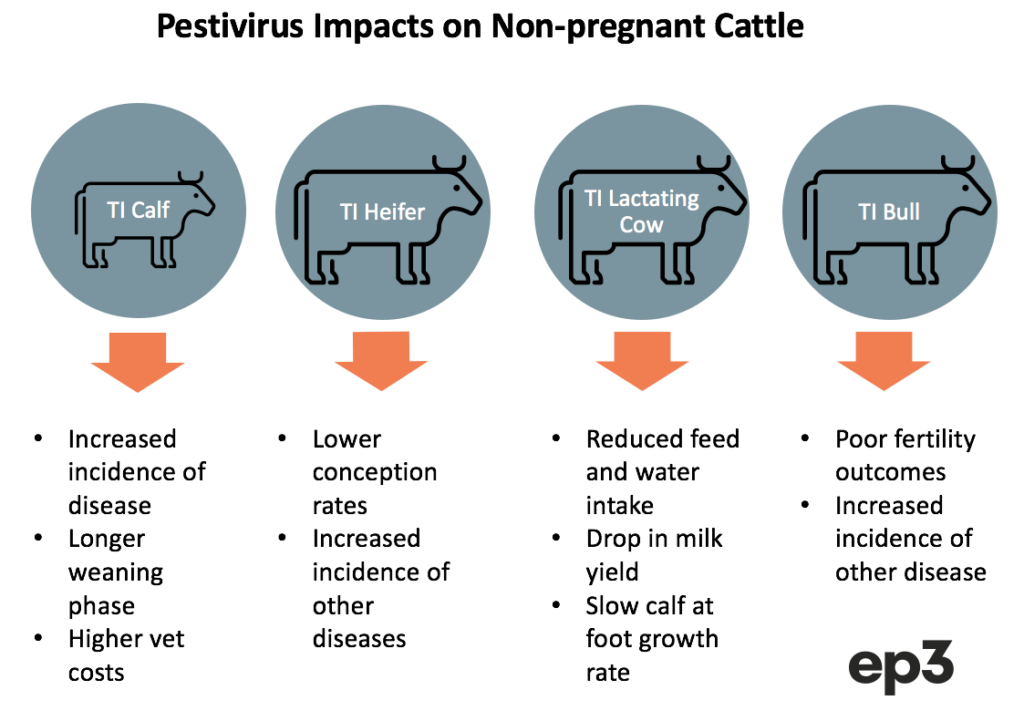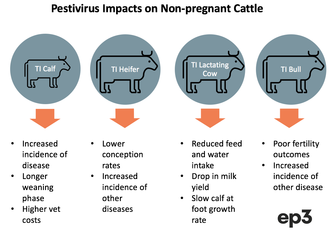 Susceptible cattle that are exposed to Pestivirus and become transiently infected (TI) can face a variety of negative impacts, dependent upon the type of cattle they are, before they recover from the virus and become immune.
