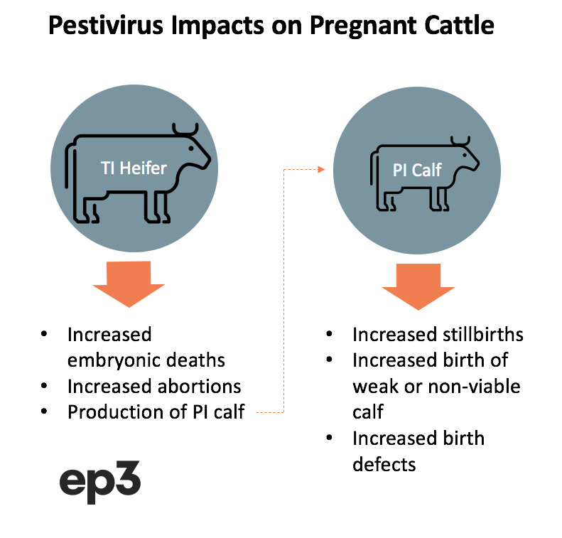 Exposure to Pestivirus during late pregnancy (120-280 days gestation) can result in an increased number of stillborn calves, a higher incidence of birth defects and a higher number of calves that are born weak, with poor growth outcomes, or that are non-viable and die at an early age.