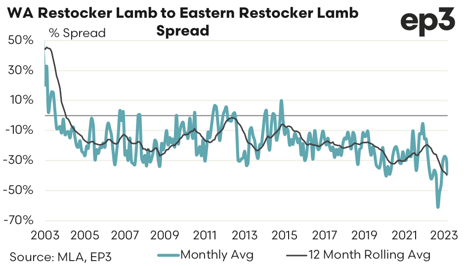 Since 2000 the long term spread for WA Restocker Lamb to East Coast Restocker Lamb sits at a 12% discount. During September 2022 the monthly average spread in WA went to the most discounted it has been on record at 61% under the east coast pricing for Restocker Lambs. Currently the monthly average spread sits at a discount of 39%.