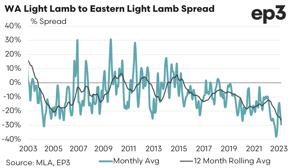 Since 2000 the long term spread for WA Light Lamb to East Coast Light Lamb sits at a 6% discount. During October 2022 the monthly average spread in WA went to the most discounted it has been on record at 38% under the east coast pricing for Light Lambs. Currently the monthly average spread sits at a discount of 30%.
