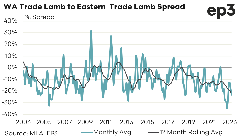 Since 2000 the long term spread for WA Trade Lamb to East Coast Trade Lamb sits at a 7% discount. During October 2022 the monthly average spread in WA went to the most discounted it has been on record at 35% under the east coast pricing for Trade Lambs. Currently the monthly average spread sits at a discount of 23%.