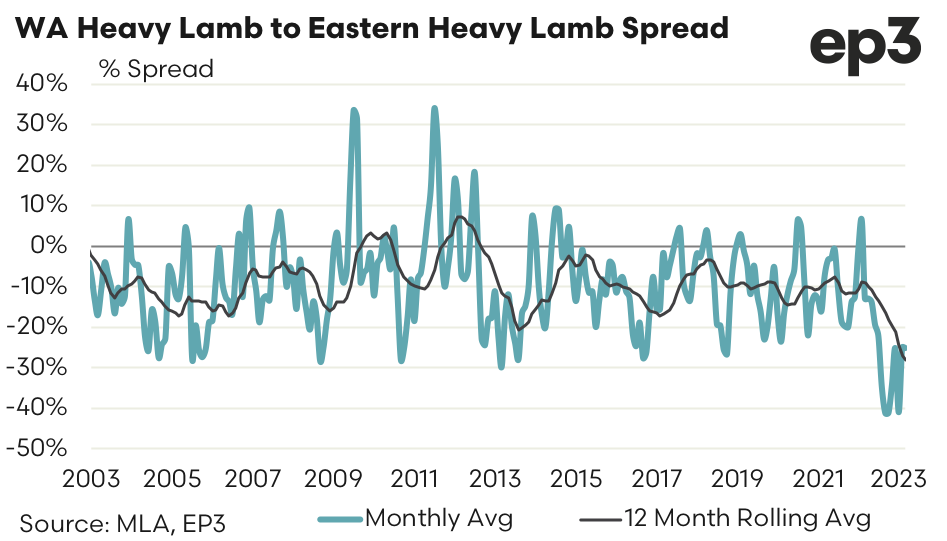 Since 2000 the long term spread for WA Heavy Lamb to East Coast Heavy Lamb sits at a 9% discount. During September 2022, October 2022 and January 2023 the monthly average spread in WA went to the most discounted it has been on record at 41% under the east coast pricing for Heavy Lambs. Currently the monthly average spread sits at a discount of 25%.
