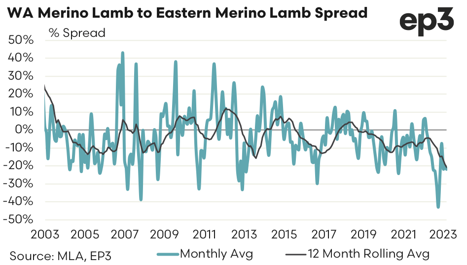 Since 2000 the long term spread for WA Merino Lamb to East Coast Merino Lamb sits at a 1% discount. During October 2022 the monthly average spread in WA went to the most discounted it has been on record at 43% under the east coast pricing for Merino Lambs. Currently the monthly average spread sits at a discount of 22%.