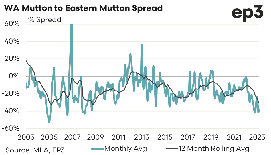 Since 2000 the long term spread for WA Mutton to East Coast Mutton sits at an 11% discount. During February 2023 the monthly average spread in WA went to the most discounted it has been since 2008 at 41% under the east coast pricing for Mutton. Currently the monthly average spread sits at a discount of 38%.