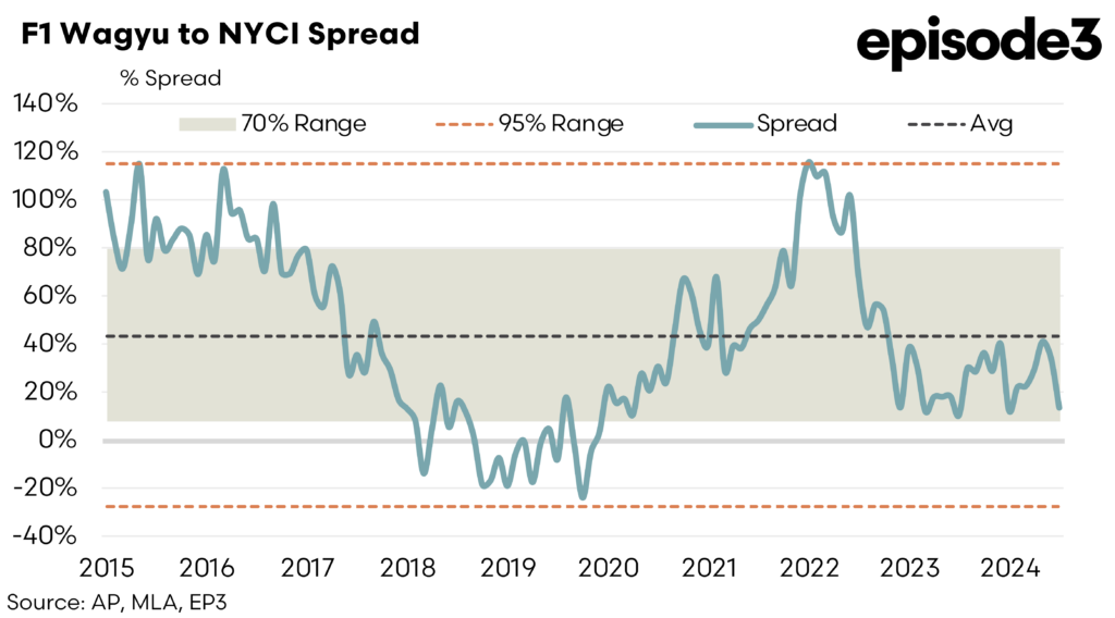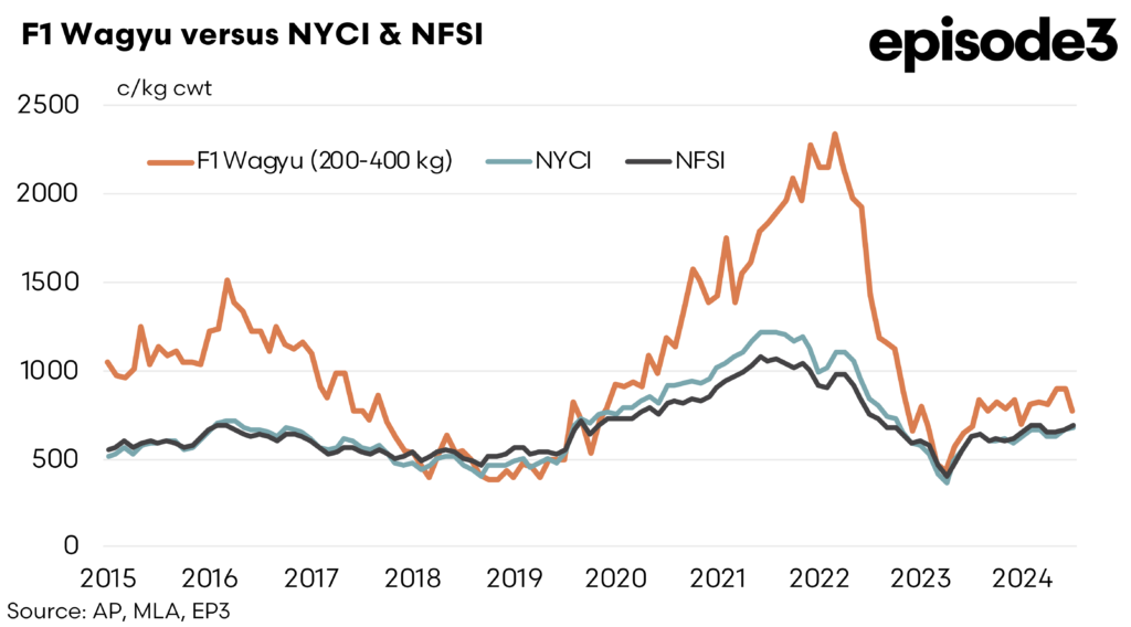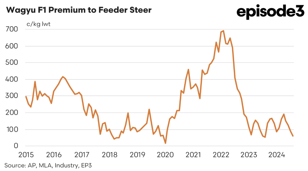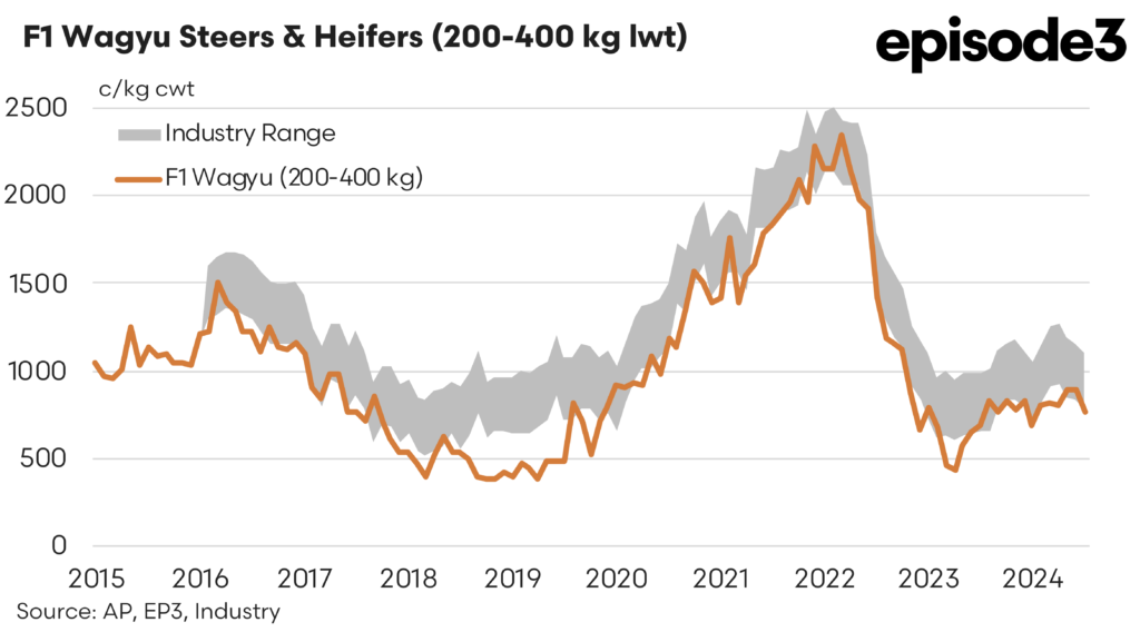 Much of the 2024 season has seen the aggregate industry F1 pricing trade at similar levels seen to the 2018/19 period of F1 Wagyu oversupply, with a premium broadly ranging between 50c to 200c.