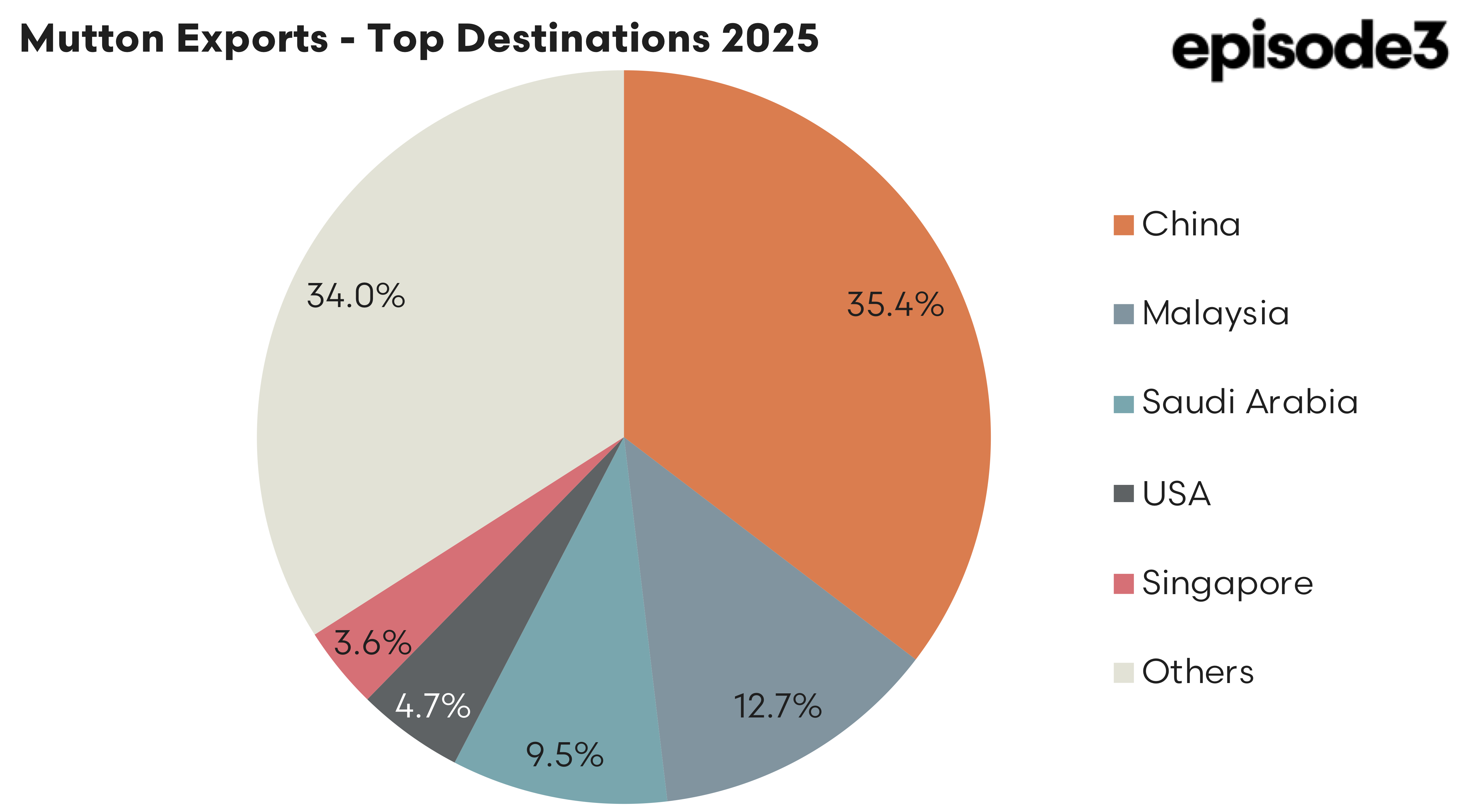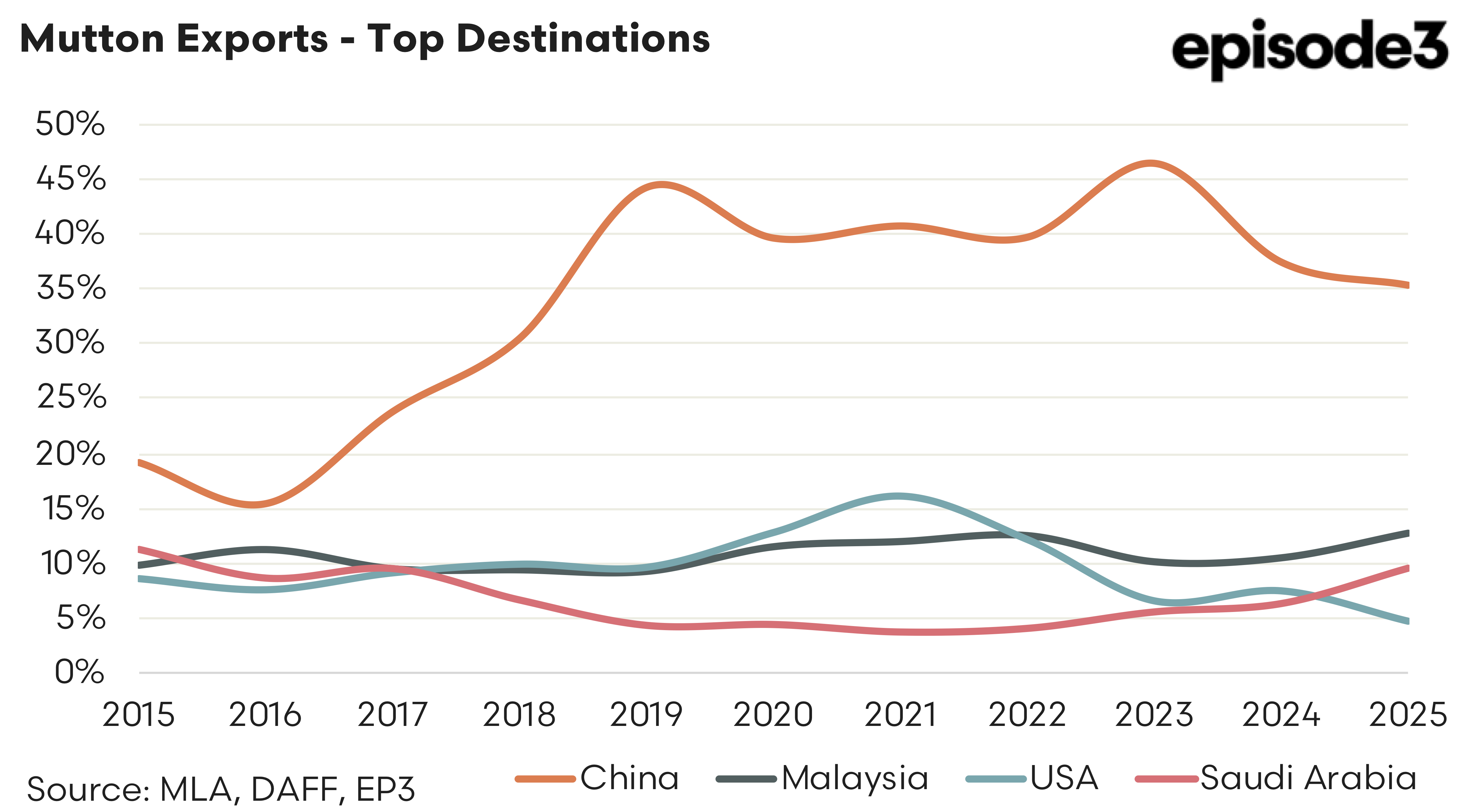 So far in 2025, China holds the majority share of the mutton trade from Australia on 35%. Malaysia displaced the USA from second place a few years back and they hold nearly 13% of the trade now. This year the USA have been further relegated to fourth spot at nearly 5% of the mutton trade as Saudi Arabia moves into third place with a share of almost 10%.
