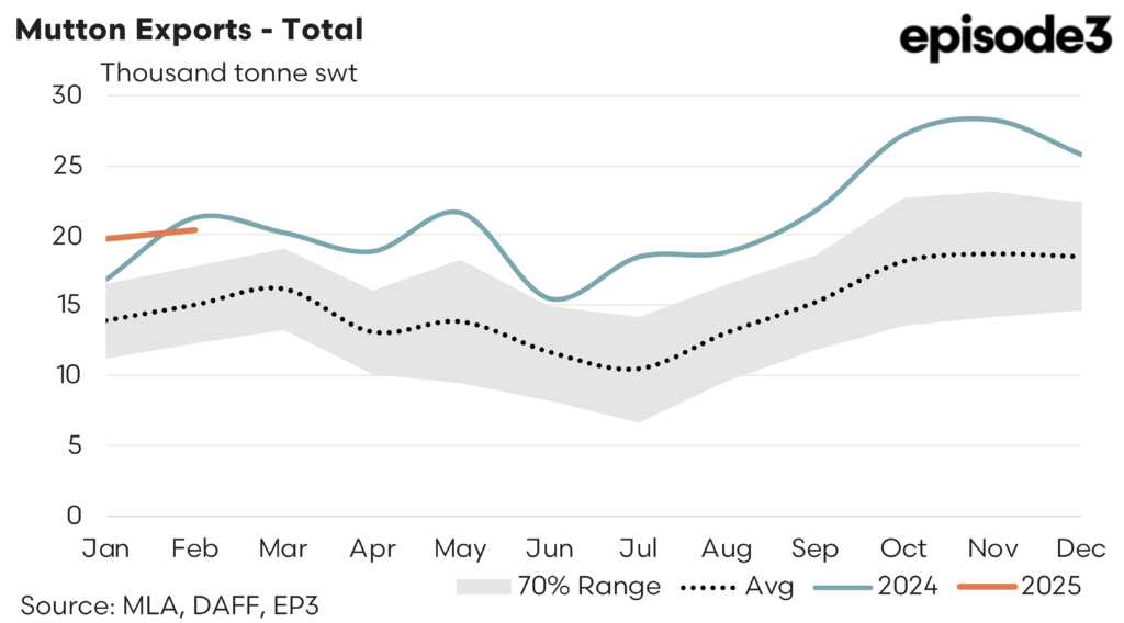 February saw total mutton exports hold steady at relatively strong levels with 20,345 tonnes reported shipped from Australia. This represents total mutton export flows that are running about 35% above the five-year average trend for mutton export volumes during February. In recent years we have seen growth in exports to market destinations like Malaysia and Saudi Arabia, but it has come at the expense of a decline in flows to the USA. Indeed, US demand for Aussie lamb has been on the increase while mutton volumes are in a decline.