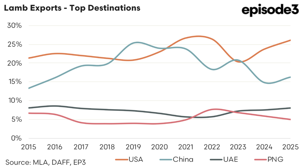 The two charts below highlights the market share of the USA in relation to Aussie mutton and lamb export flows. From 2015 through to 2022 there was an ongoing mutton battle with Malaysia for second spot and in recent years with Saudi Arabia for third place. So far in 2025 the USA has been clearly defeated. However, as the lamb market share highlights the US have opened up a pretty convincing lead over China since 2023 to dominate top position.