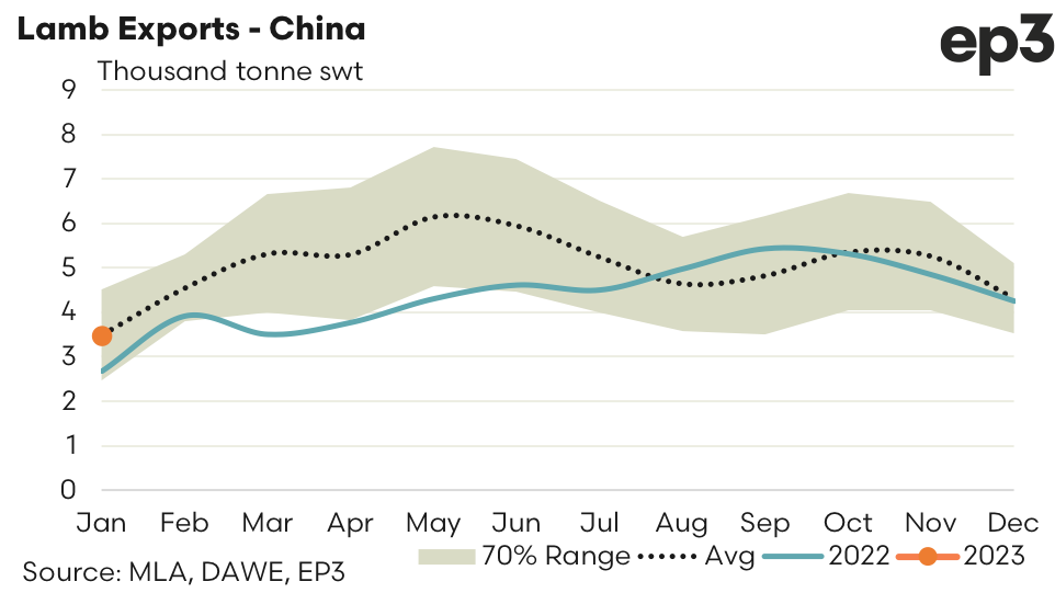• Lamb export volumes for Australia to China during January 2023 have shown an improvement on the 2022 start to the season coming in 30% higher than last year.