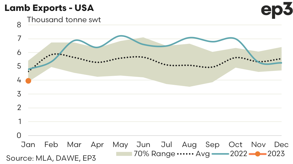 Unfortunately, after nearly two years of exception demand for Aussie lamb the USA have started the 2023 season in a relatively poor fashion. There was 3,973 tonnes of Aussie lamb exported to the USA over January 2023, which is 17% under the flows seen during January 2022 and 14% below the five-year average levels reported for January.