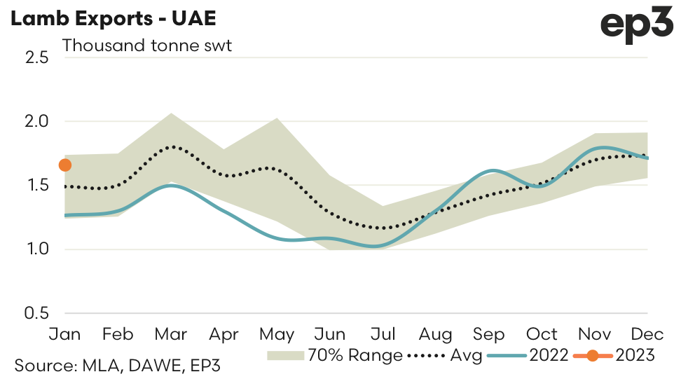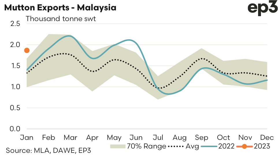 Malaysia edged out the USA as second top destination for Aussie mutton during 2022 and they have managed an equally impressive start to 2023 with 1,870 tonnes swt reported shipped over January. This represents levels that are 40% above the five-year January average for Aussie mutton exported to Malaysia.